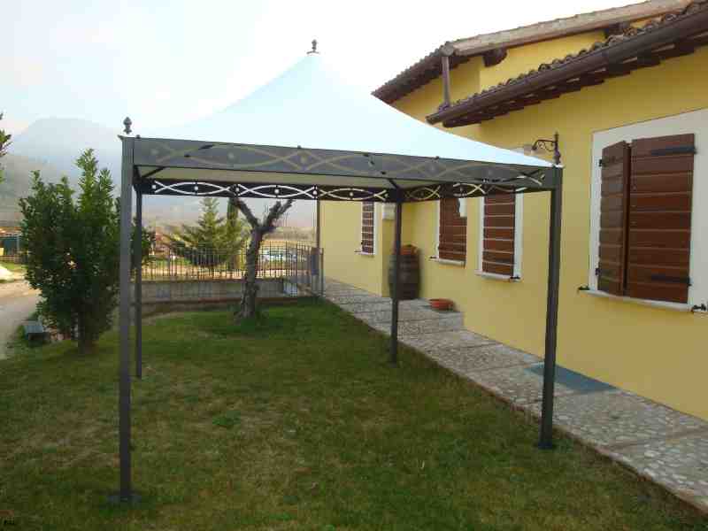 Gazebo acciaio verniciato in cataforese e polvere ipossidica mod. NETTUNO mt. 4×4 completo di copertura PVC 650 gr. ignifugo Altezza minima cm. 200 Max 250 circa